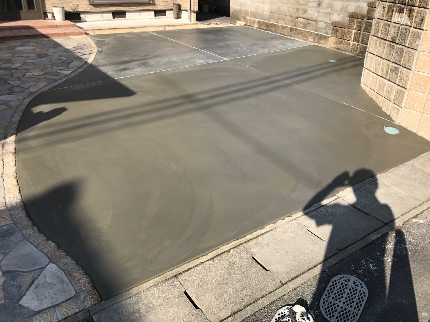 外構プロデュースbyAinGarden(https://www.ain-garden.com/3690)アプローチに沿ってカーブを描く土間コンクリート。駐車スペースとして作られています。中央を十字で分けることで、目印として役立つよう施工された事例です。
