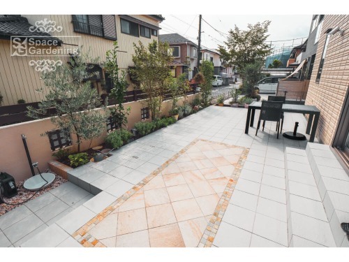 スペースガーデニング(https://www.s-gardening.com/sekou.php/detail/00003427_02)タイルでテラスを作った事例です。淡いオレンジのタイルを斜めに張り、動きを感じられる仕上がり。ステンドグラスのような細かいタイルで作られた枠が目を引きます。周りの淡いグレーのスタンダードなタイルとの対比で、明るい印象です。